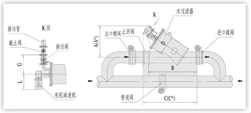 型號 管徑 (mm) 過濾流量 (m3/h) 過濾面積 (cm3) 排污閥DN (mm) 一次清洗 水量(L) 電機(jī)功率 (KW) 重量 (Kg) D (mm) A (mm) A (mm) B (mm) C (mm) C (mm) L (mm) G (mm)