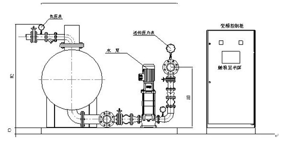 RWG系統(tǒng)智能型無負壓變頻供水設(shè)備是由穩(wěn)流調(diào)節(jié)器、負壓抑制器、水泵機組、智能變頻控制柜、遠傳壓力表、各種閥門管件等組成。其原理圖如下所示。